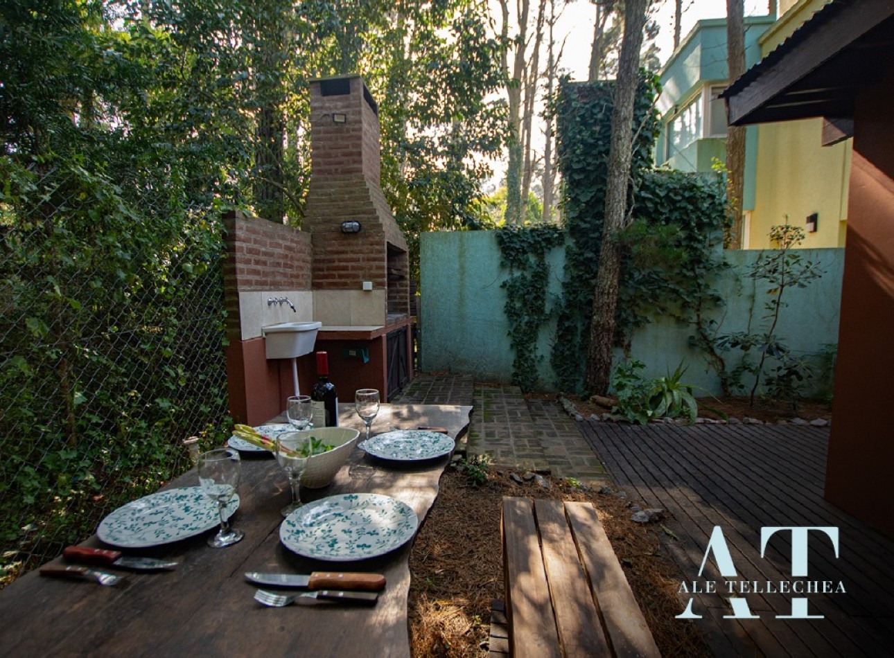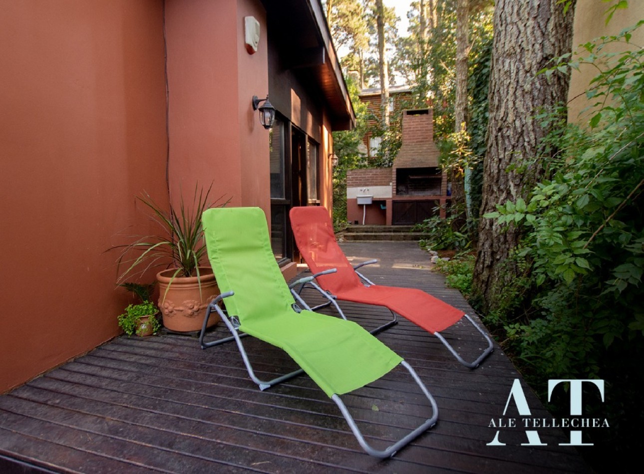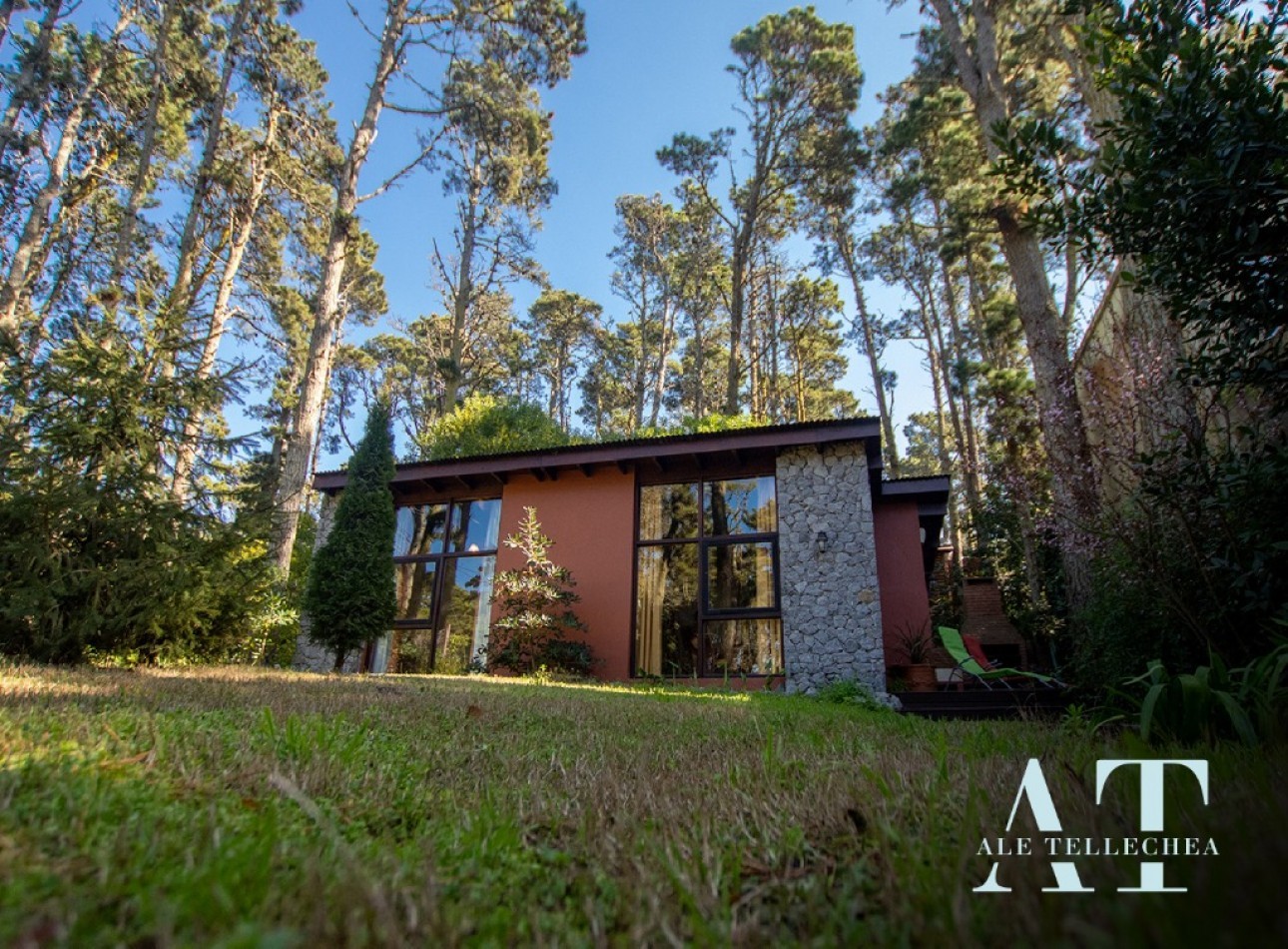 Espacios Exteriores: Cuenta con un amplio lote de 300 m² donde destaca su deck de madera con parrilla, el corazón de las tardes de verano en el bosque.