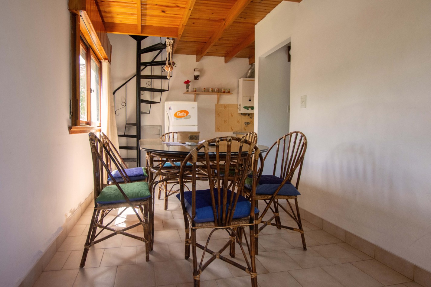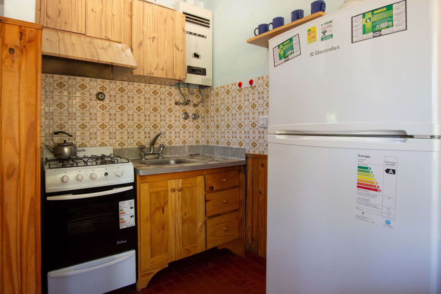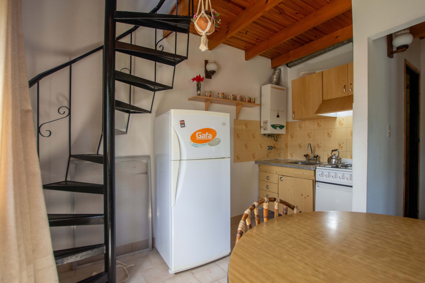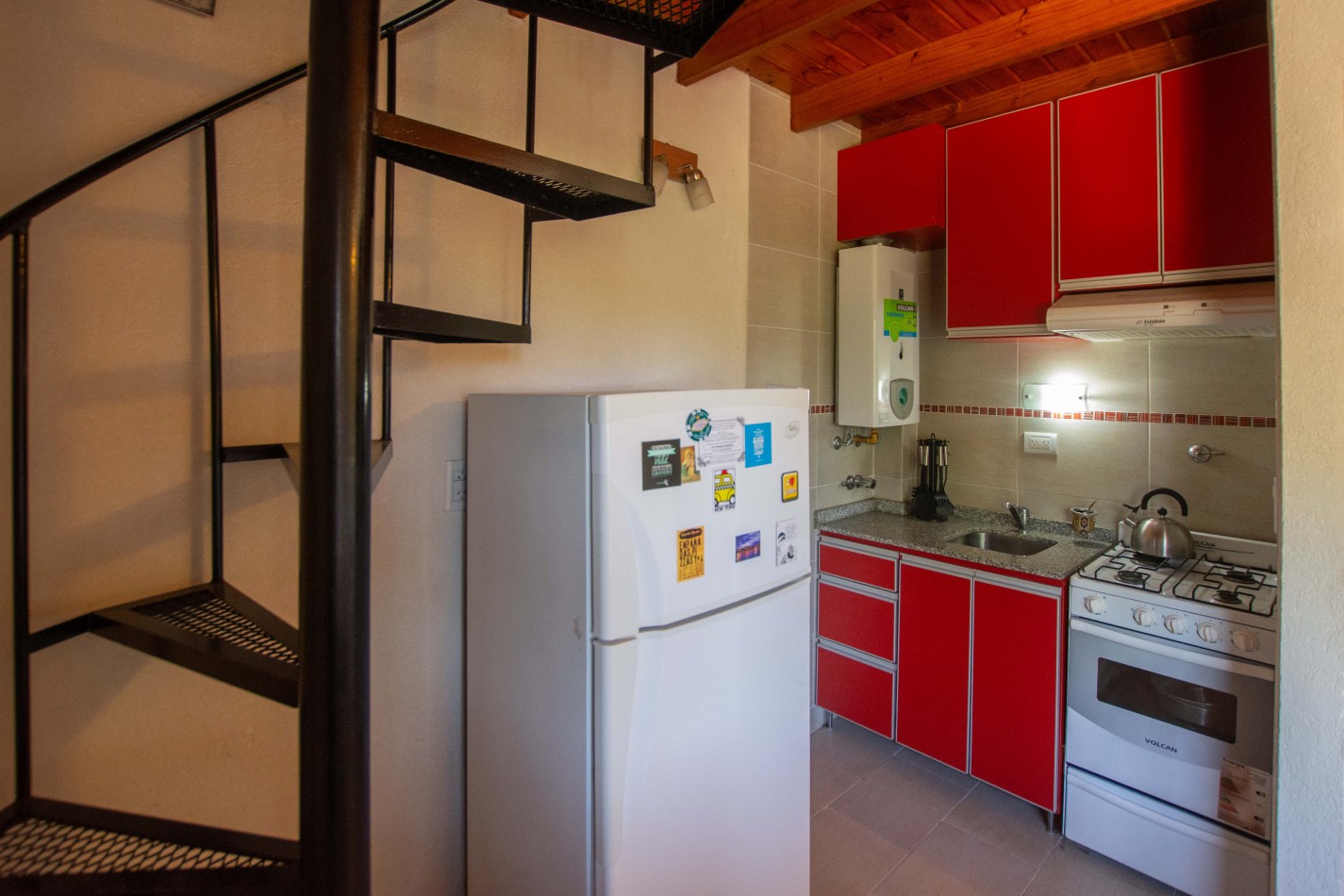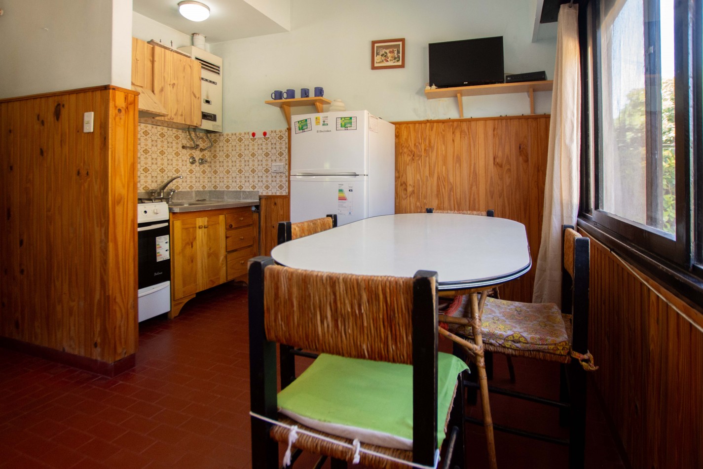Heladera / Cocina / Calefón (gas envasado) / Cama matrimonial / Mesa y sillas / Sofá cama / Camas en altillo